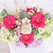 роза белая - 4 шт., альстромерия розовая - 3 шт., гербера розовая - 4 шт., эустома белая - 3 шт., декоративная зелень (эвкалипт), оазис, коробка.